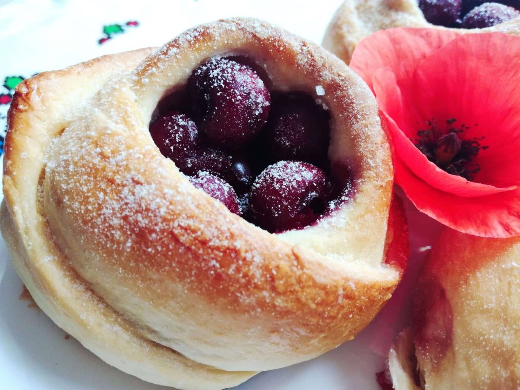 Summer is in full swing and we can enjoy its generous gifts – fruits and berries. So, it’s a wonderful idea to bake fluffy, light and soft buns with a juicy cherry filling. I’ll guide you through simple steps of how to make predough, how to knead the dough and how to easily shape buns in the form of a rose. Let’s start together:)